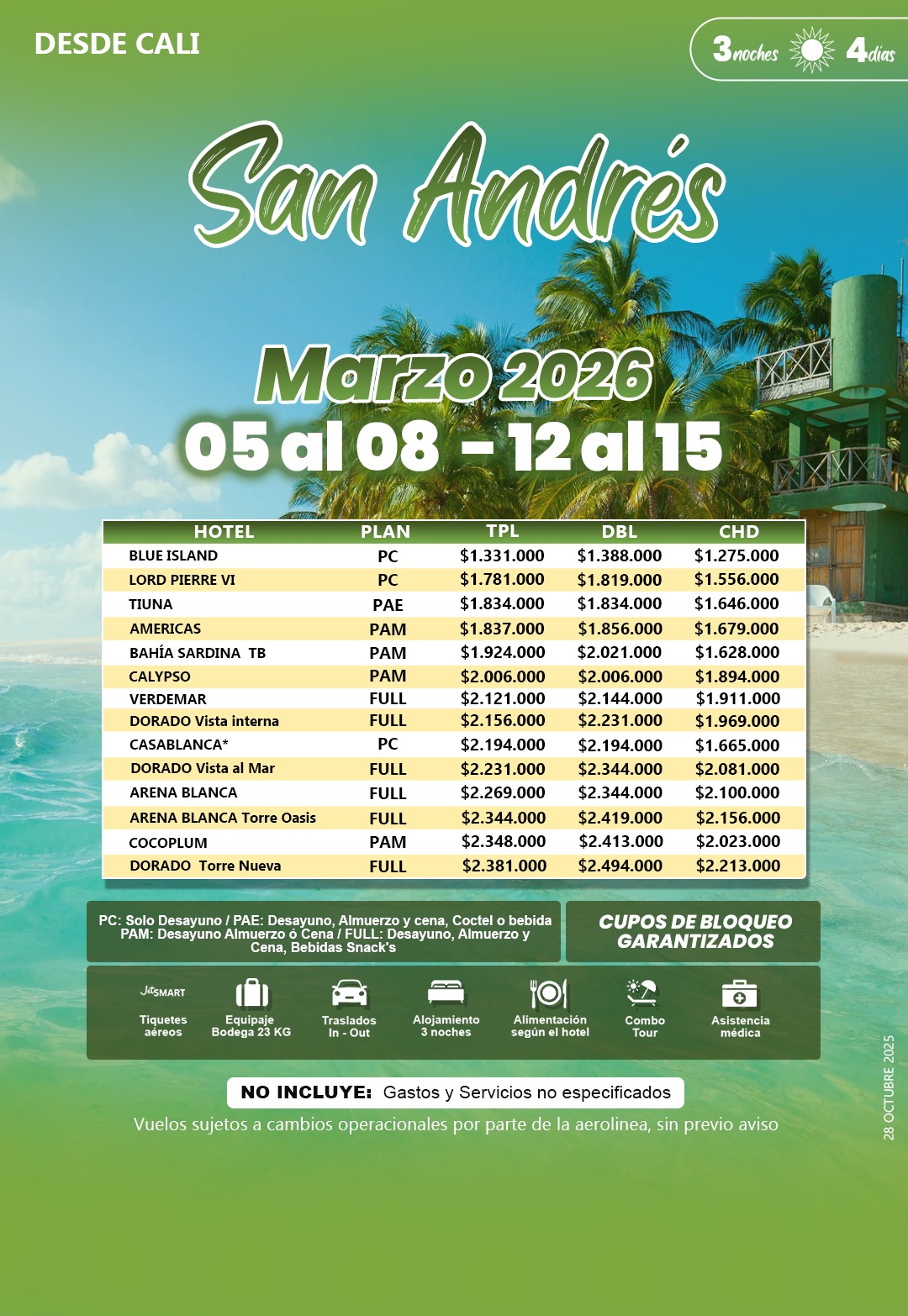 • Tarifas en pesos colombianos por persona, sujetas a disponibilidad y cambio sin previo aviso.