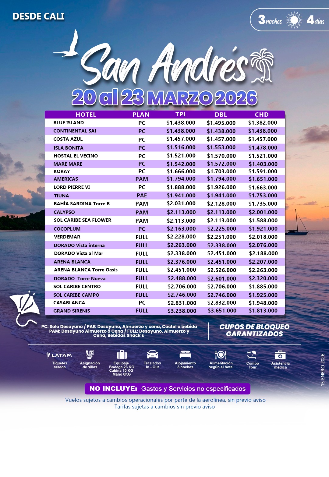 • Tarifas en pesos colombianos por persona, sujetas a disponibilidad y cambio sin previo aviso.